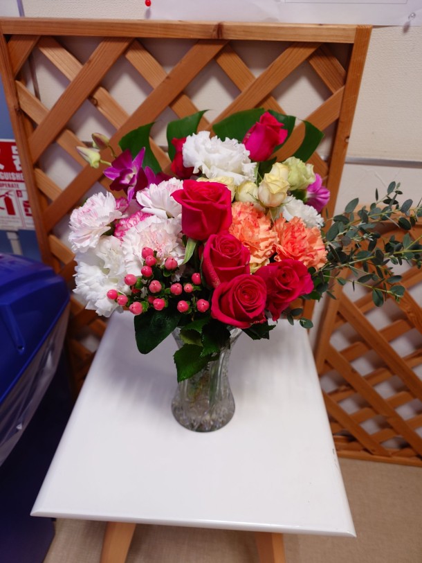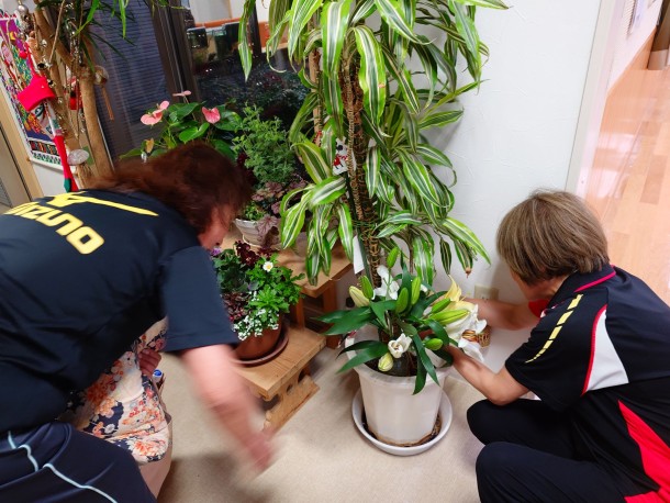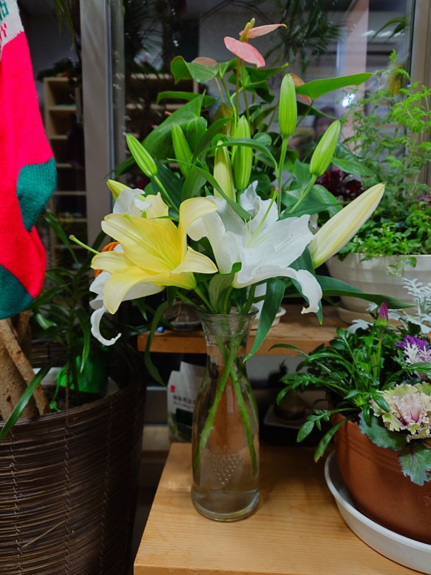 かおりちゃんたちが、カサブランカはどこに飾ろうかと思案中。