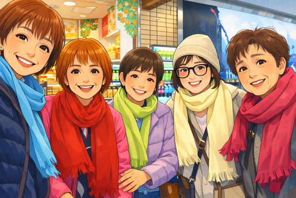 みんなでそれぞれ違う色のマフラー買ったよ。