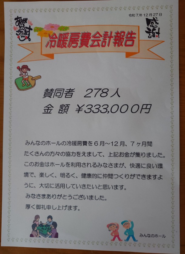 こんな年末になって冷暖房費の寄付金のご報告なんですが。